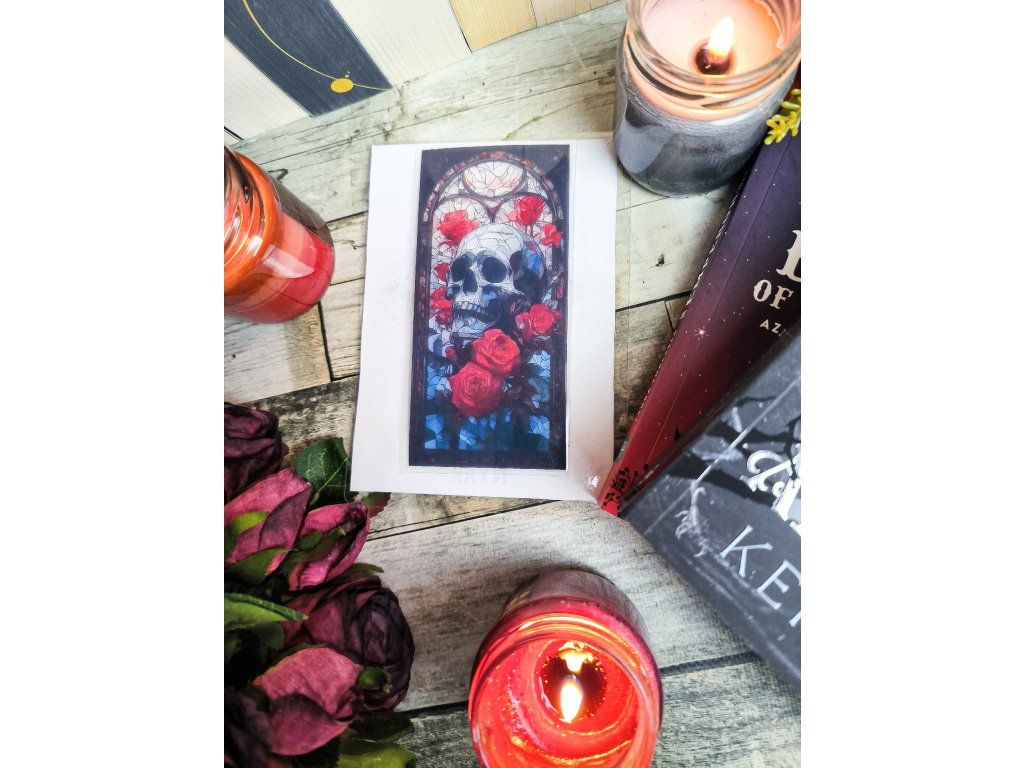 Dark romance hangulatú, ólomüveg könyvjelző koponyával és rózsákkal.