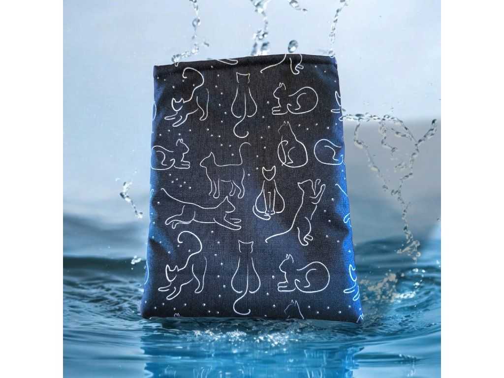 Wasserdichte Buchhülle mit weißen Katzen-Umrissen auf schwarzem Grund.