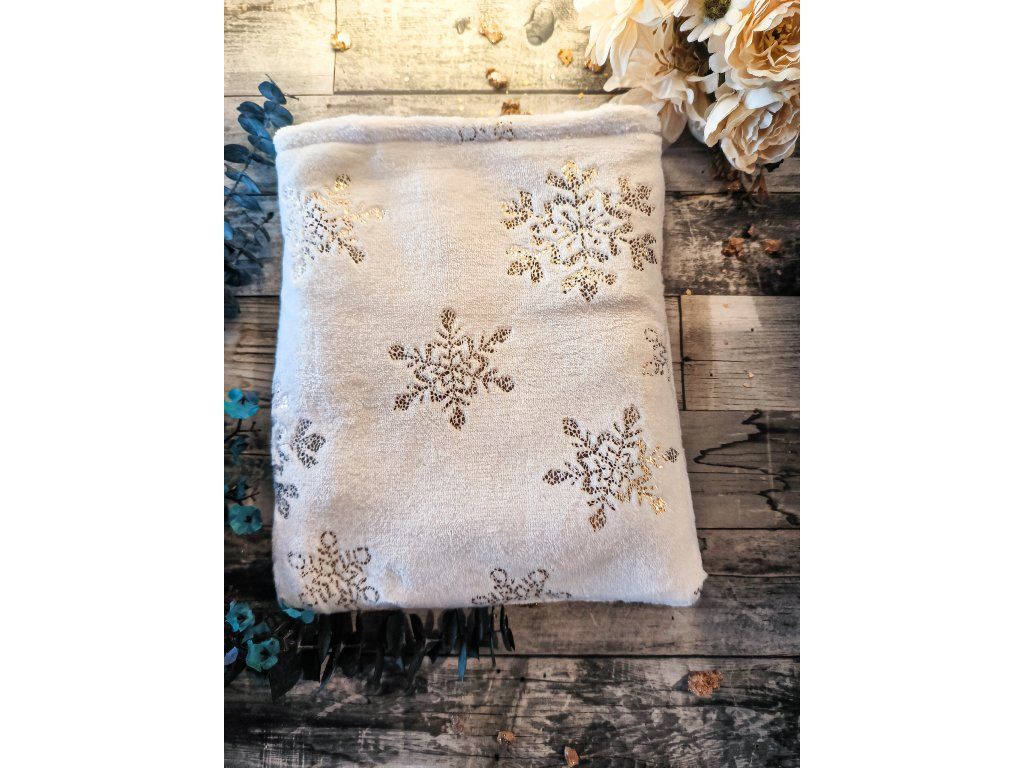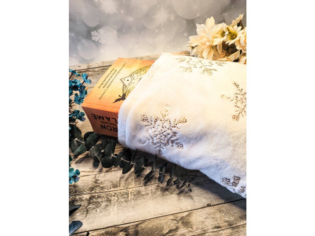 * **Das Äußere:** Ein luxuriös weicher, weißer Plüschstoff, verziert mit strahlend goldenen Schneeflocken, der die zauberhafte Schönheit eines Wintermorgens einfängt.