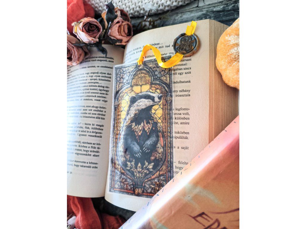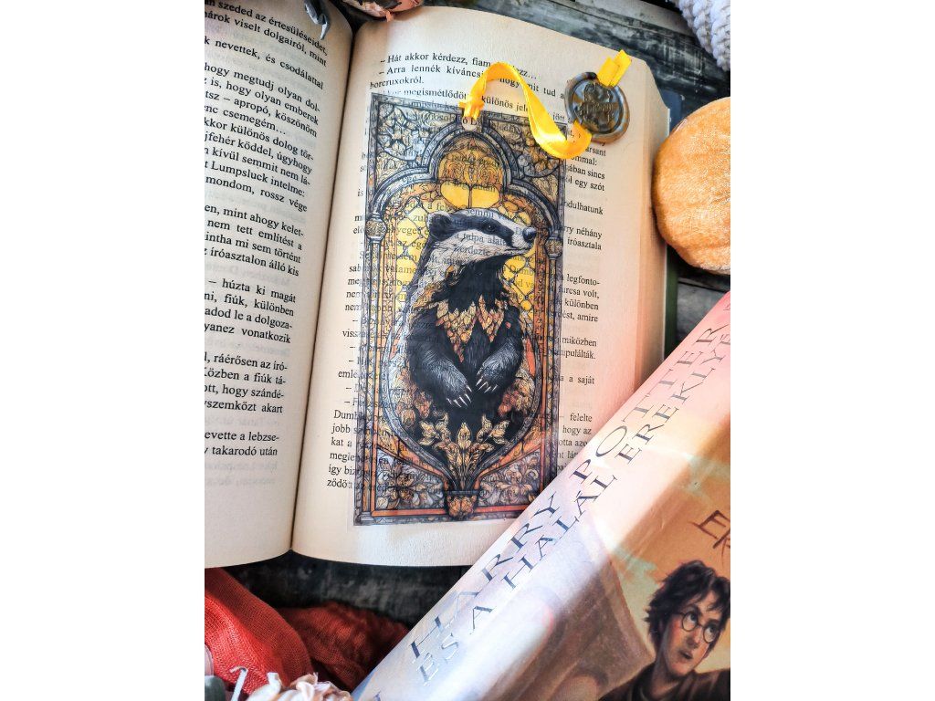Machen Sie das Lesen zu etwas Besonderem mit diesem bezaubernden, transparenten und laminierten Lesezeichen, das vom Dachs des Hauses **Hufflepuff** inspiriert wurde! 🦡✨ Das Symbol für Treue, Ausdauer und Freundschaft erstrahlt in Gold- und Schwarztönen und beschwört die warme und freundliche Atmosphäre des Hauses herauf.