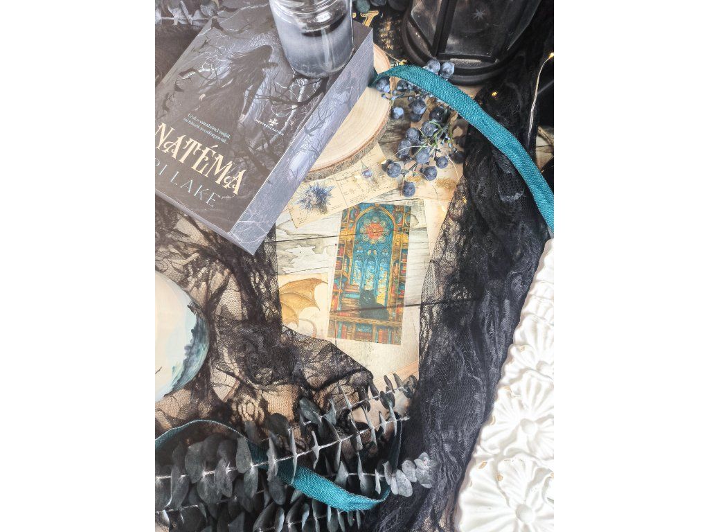 Ein stimmungsvolles Lesezeichen im Buntglasstil mit einer schwarzen Katze und Büchern.