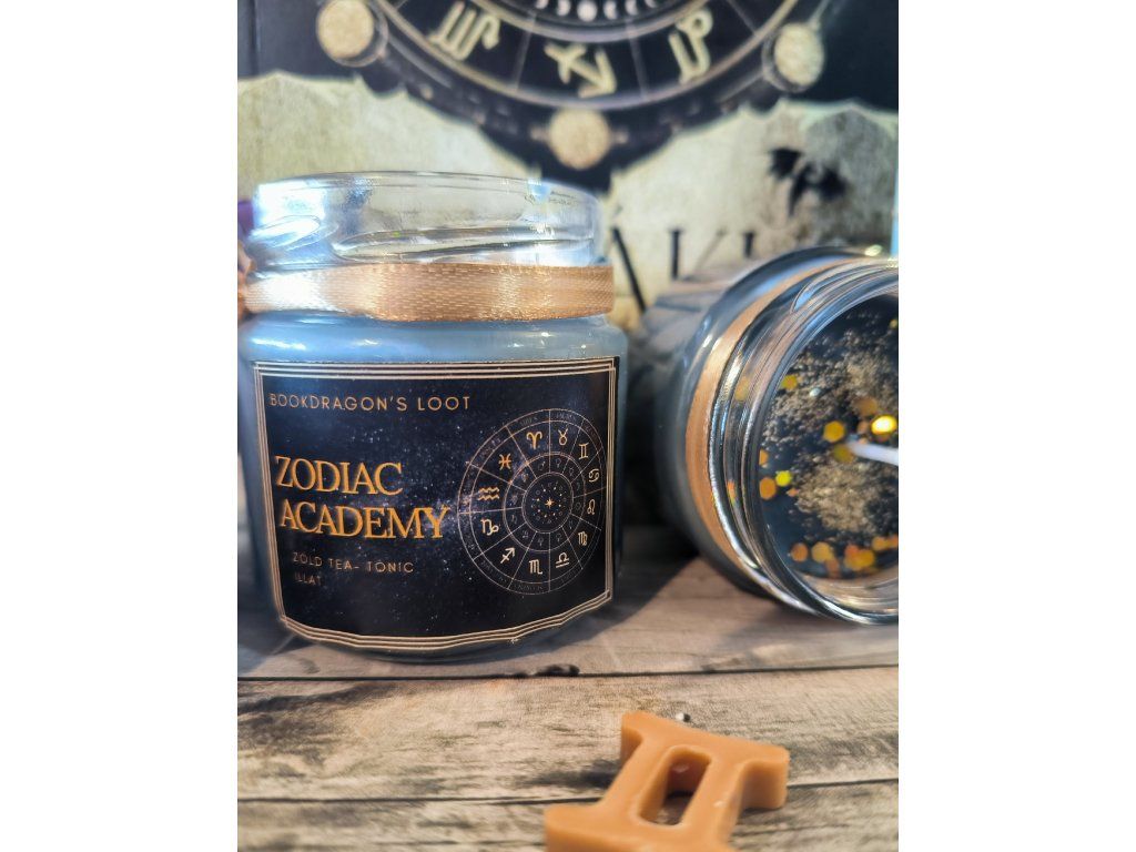 Diese Kerze wurde für die Serie "Zodiákus Akadémia" (Zodiac Academy) von Caroline Peckham und Susanne Valenti entworfen, in **Dunkelgrau mit goldenem Glitzereffekt**.