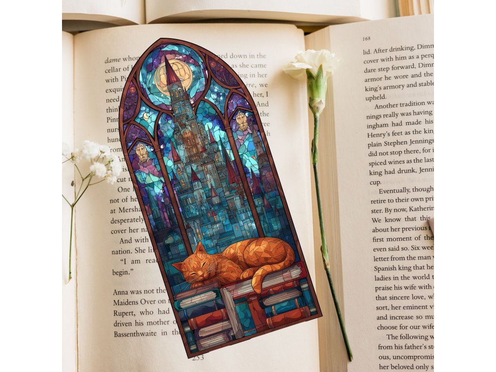 Hangulatos ólomüveg könyvjelző vörös cicával és könyvekkel.