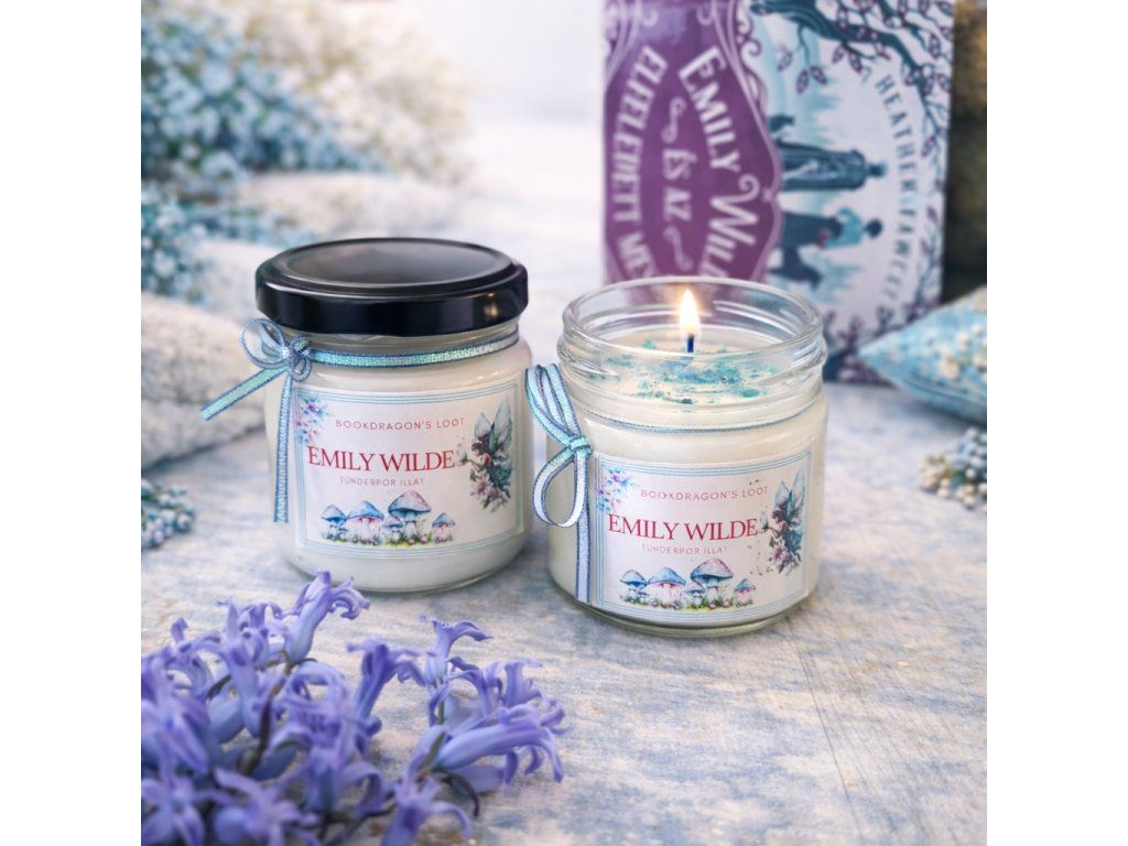 Ez a gyertya Heather Fawcett: Emily Wilde tündérenciklopédiája sorozatához készült, fehér színben, türkiz csillogással.