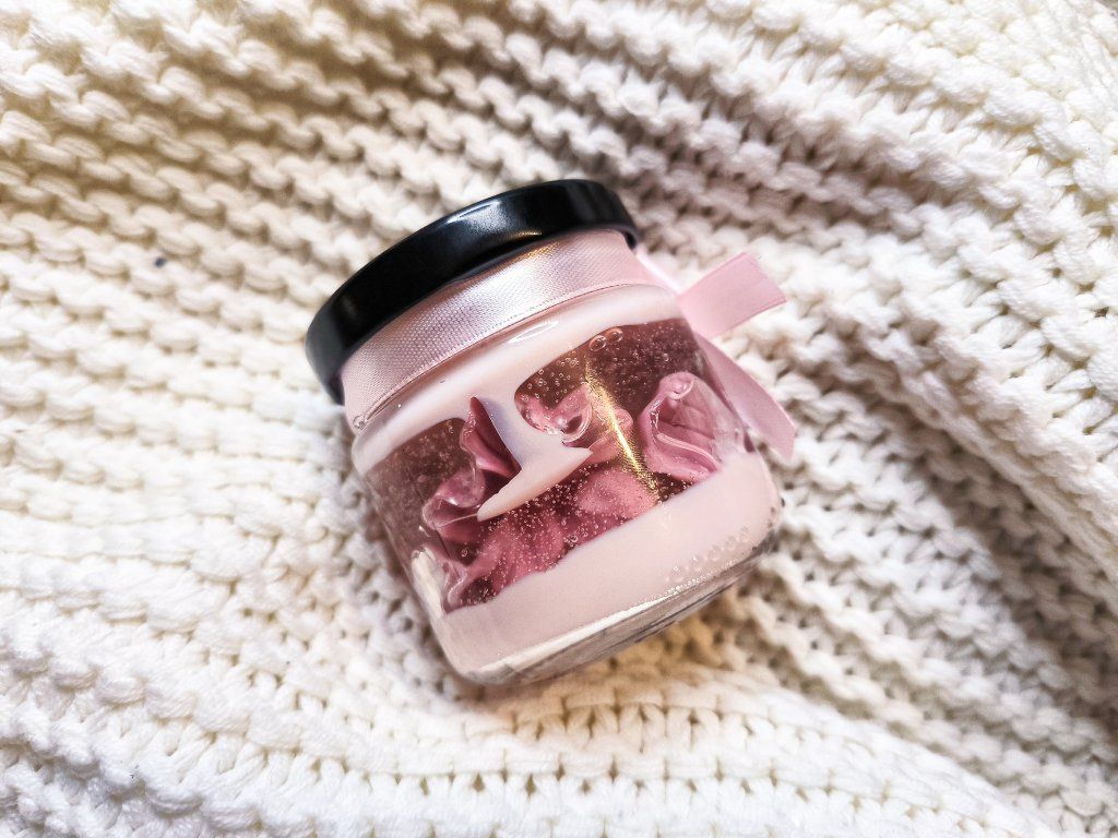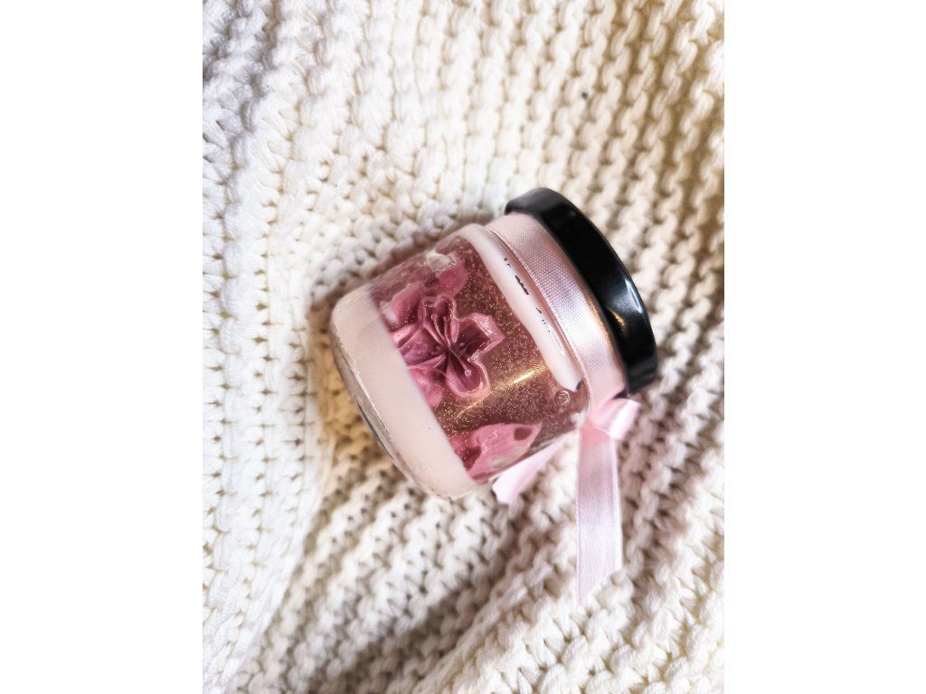 Its specialty is the **transparent, bubbly jelly candle layer** running through the middle, which blends with the wax. Flowers and petals are visible inside.