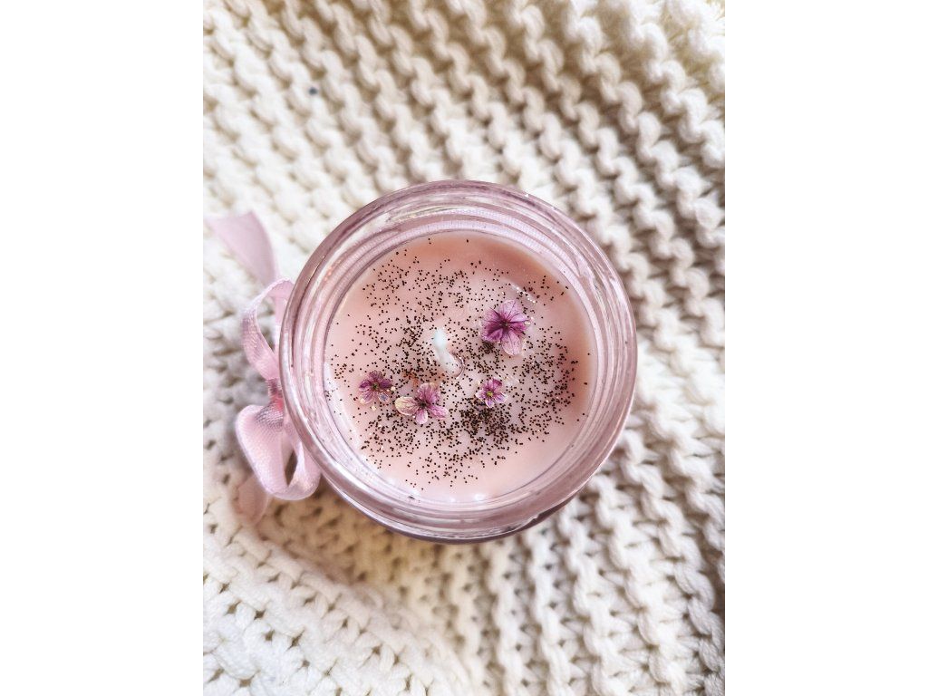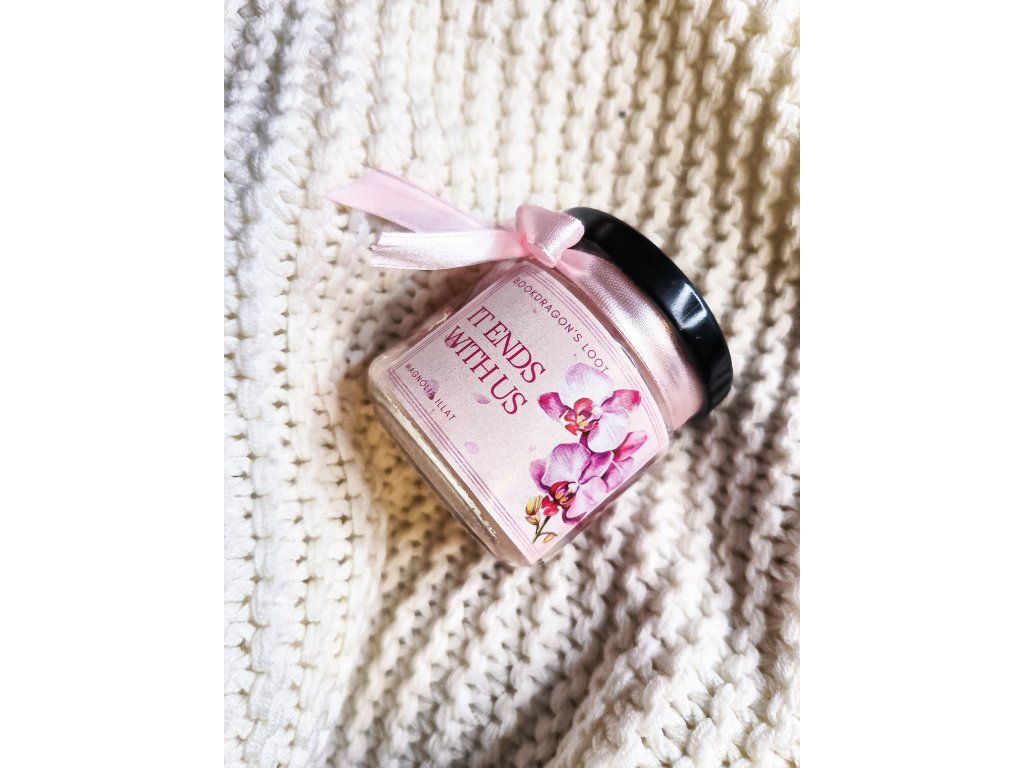 This candle was created for **Colleen Hoover’s *Velünk véget ér - It Ends with Us***, in a peach color with pink flowers. The top is sprinkled with tiny blossoms.