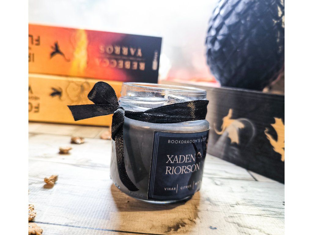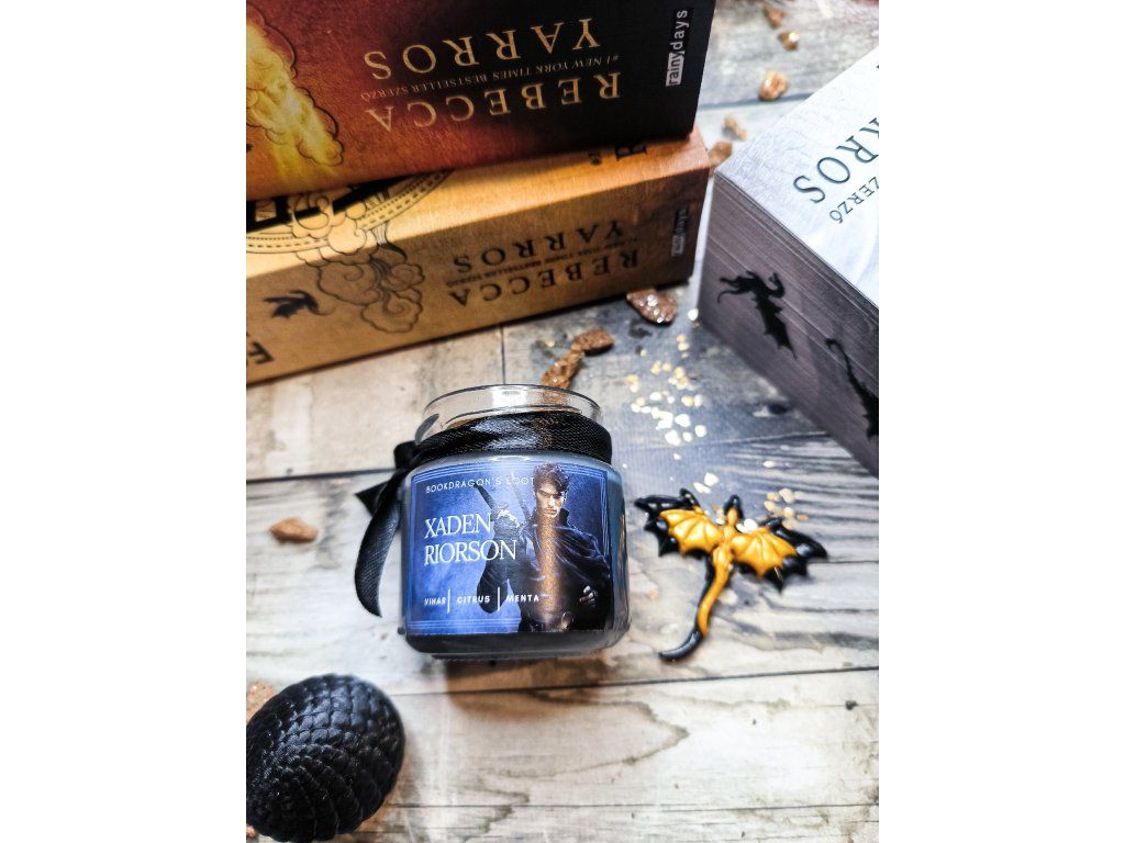 This candle was created for Rebecca Yarros: "Negyedik szárny" ("FOURTH WING") series; a **dark grey candle with hints of blue**.