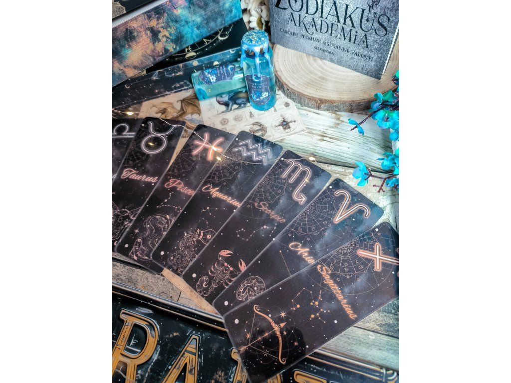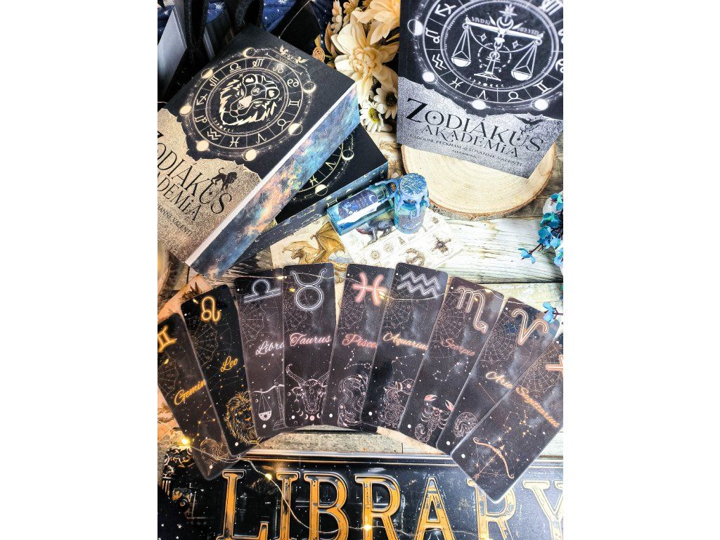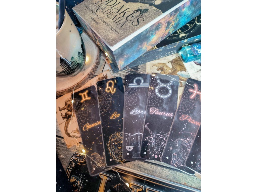 Enter the world of the Zodiac Academy with this special laminated bookmark set, inspired by the popular fantasy novel. The package contains three bookmarks featuring the **Gemini, Leo, and Libra** (Ikrek, Oroszlán, and Mérleg) zodiac signs.