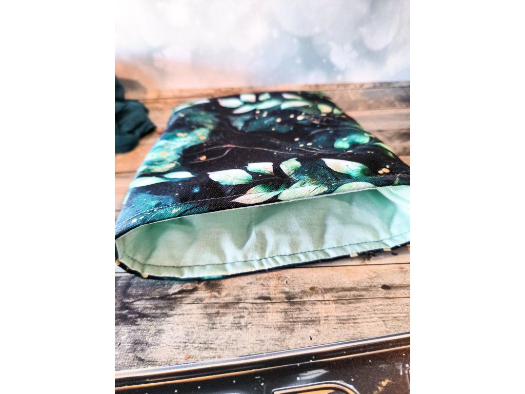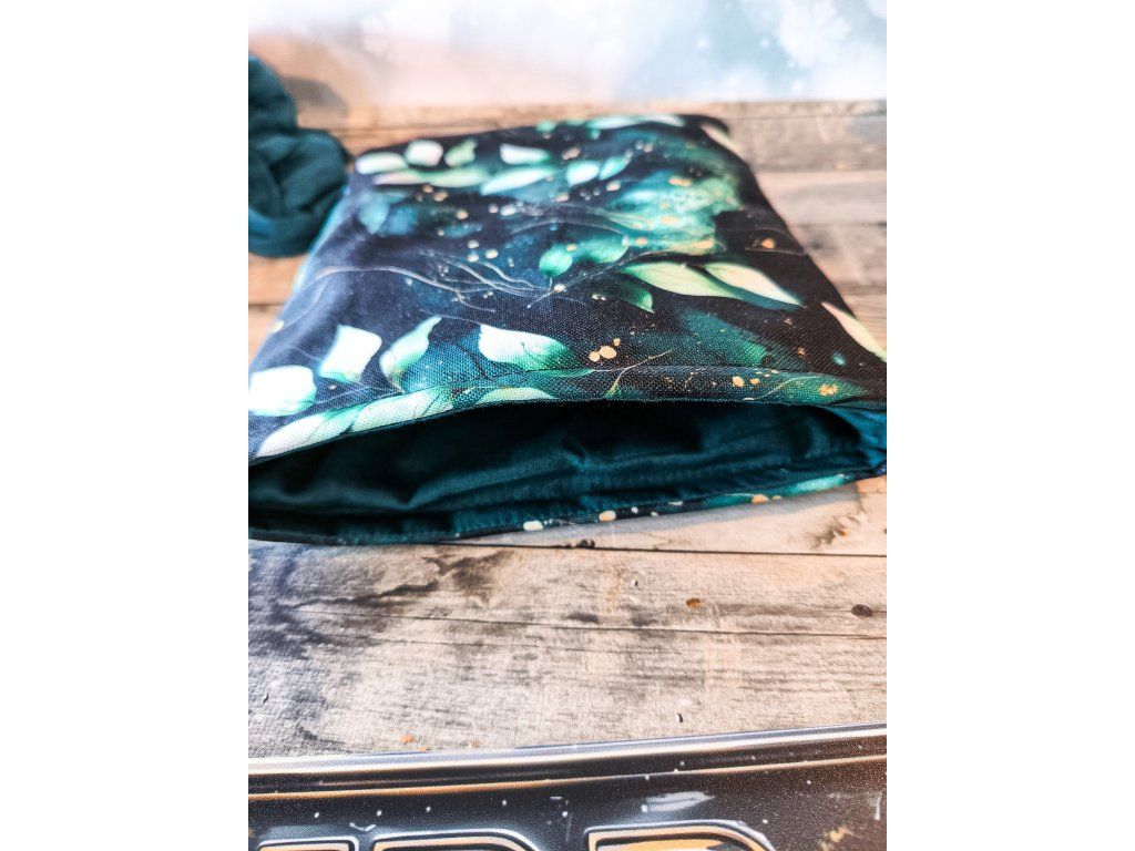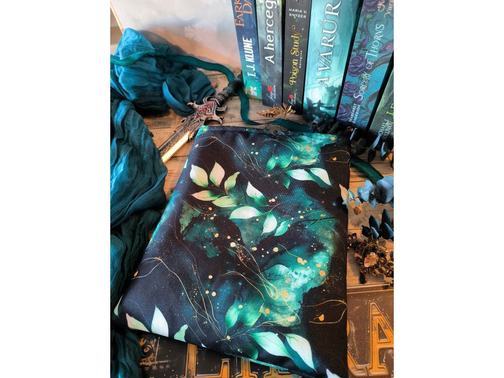 A waterproof book protector decorated with leaves and vines on a dark green background.