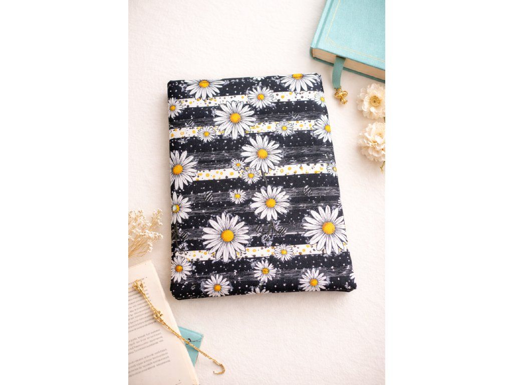 Fekete - fehér csíkos alapon margarétás, vízálló könyvvédő.