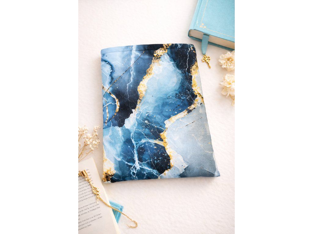 Kék, arany és fehér színekben játszó modern, márvány hatású vízálló könyvvédő.