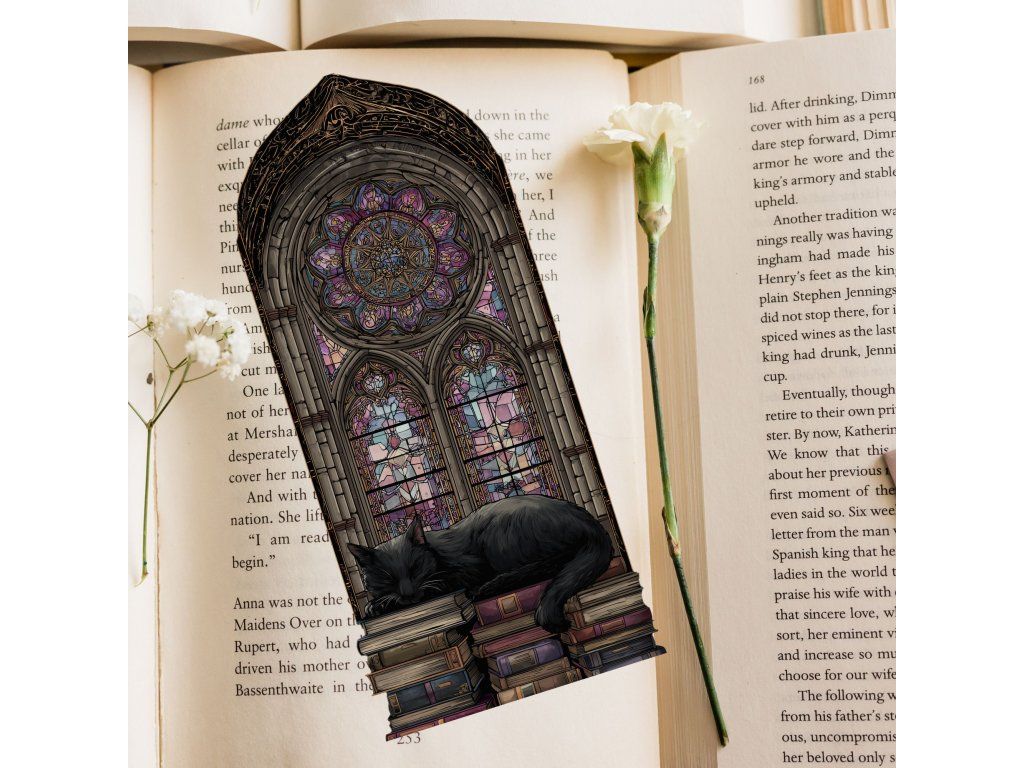 Laminált könyvjelző – Fekete macskás| Ólomüveg hatású, átlátszó