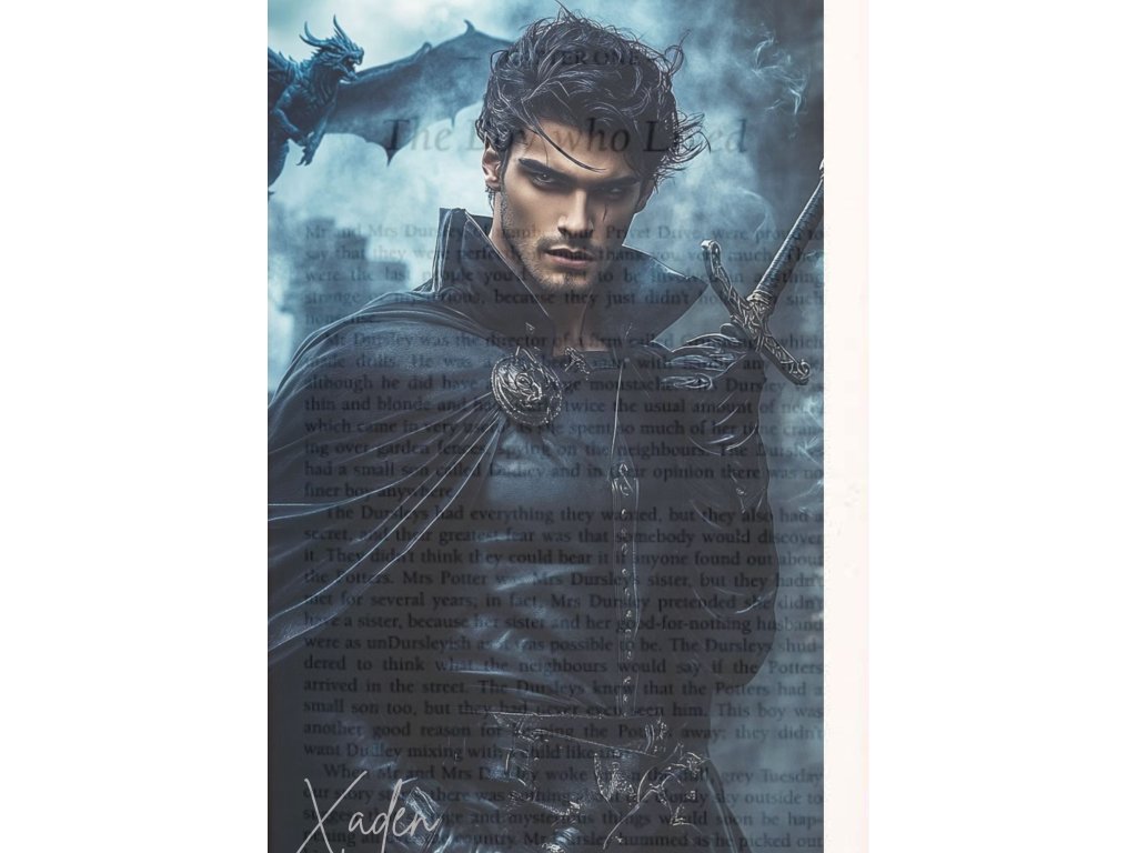 Ez a fanart Rebecca Yarros: Negyedik szárny - Fourth Wing sorozatához készült, Xaden Riorsont ábrázolja, a háttérben kék sárkánya, Sgaeyl látható.